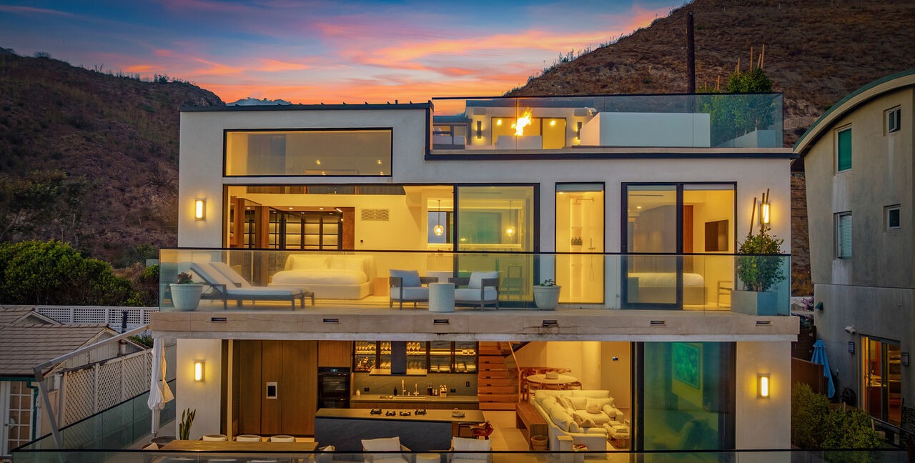 A stunning outdoor kitchen integrated into a modernist hillside residence, featuring a concrete waterfall island with dark wood cabinetry, floor-to-ceiling windows framing dramatic canyon views, and sophisticated black metal hardware against warm wood and white finishes. The space exemplifies contemporary desert modern design with seamless indoor-outdoor flow and museum-quality execution.