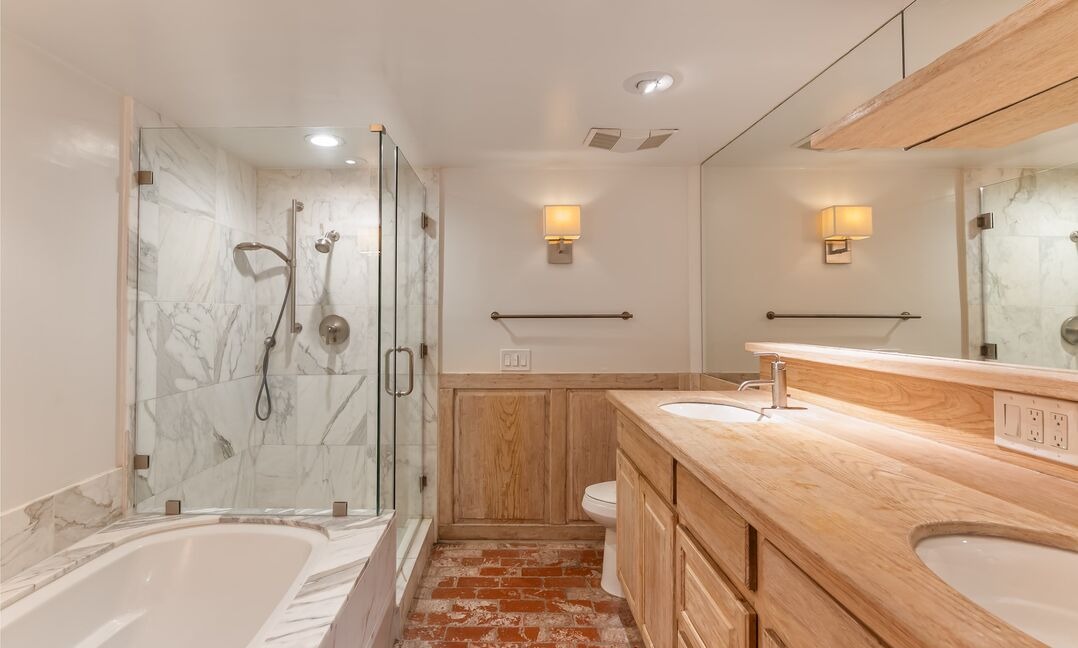 Countertop: MarbleCabinets: Natural WoodCabinet Color: Light WoodFlooring: Terracotta TileCeiling: StandardVanity: Marble Top Double SinkShower: Frameless Glass Marble SurroundTub: Built InTile: Large Format Marble
