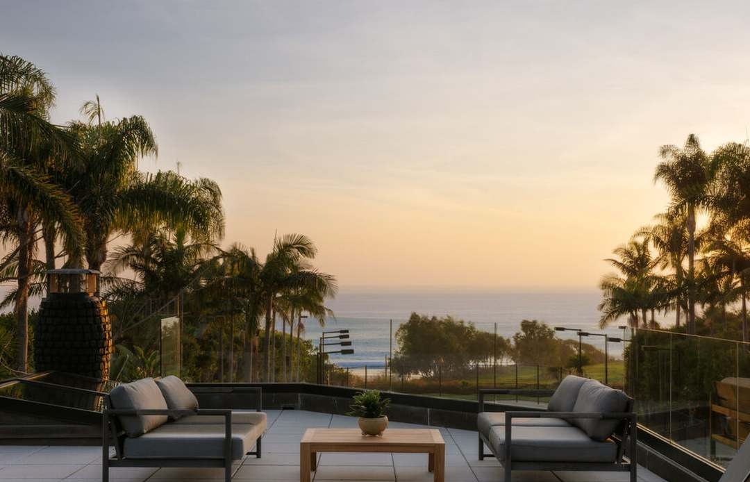 A sophisticated coastal patio featuring panoramic ocean views framed by mature palm trees and contemporary lounge seating with gray cushions on sleek black frames. The minimalist composition—anchored by a warm wood coffee table and polished stone terrace—embodies California modern luxury with serene, resort-quality ambiance.