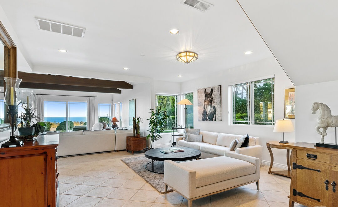 A sophisticated coastal living room featuring expansive ocean views, warm neutral palette, and organic modern design with exposed wooden beams and high ceilings. The space seamlessly integrates indoor-outdoor living with carefully curated furnishings, brass accents, and a curated art collection including equestrian artwork and sculptural pieces.