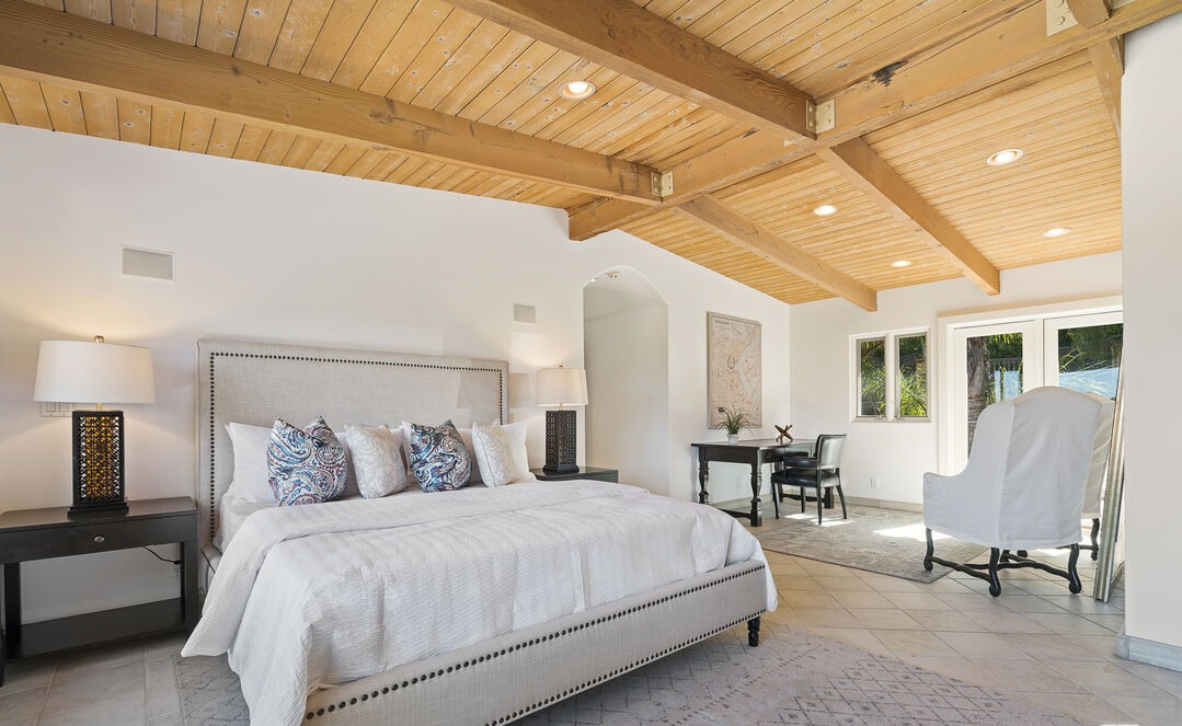A sophisticated primary bedroom suite featuring exposed wood beam ceilings and abundant natural light from expansive multi-pane windows, combining transitional elegance with organic modern warmth. The neutral palette of cream and white is punctuated by blue-patterned accent pillows, while the upholstered headboard, integrated desk nook, and refined furnishings create a serene, luxurious retreat with excellent proportions and high-end finishes.