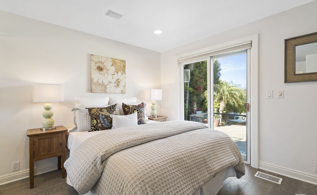 A serene primary bedroom showcasing transitional design with abundant natural light from expansive sliding glass doors opening to a tropical outdoor space. The room balances warmth through natural wood furnishings and earth-toned bedding with clean modern lines and soft neutral walls, creating a sophisticated yet inviting retreat.