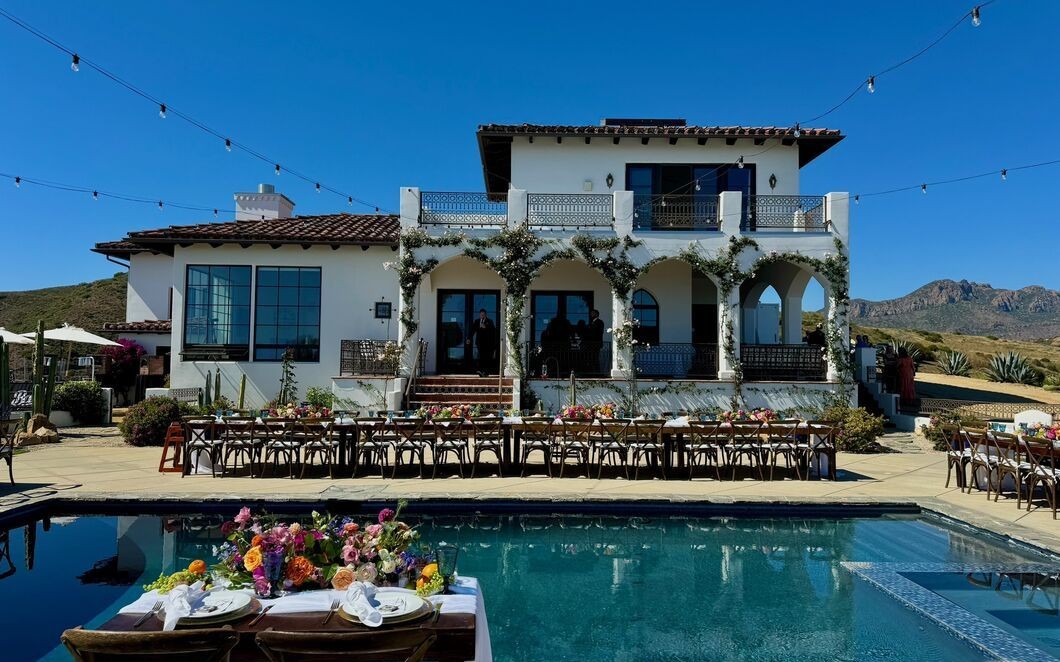 A breathtaking Mediterranean-style resort pool area featuring a striking white stucco villa with arched openings, wrapped in climbing ivy, overlooking a pristine turquoise swimming pool framed by stone terracing. The space seamlessly blends indoor-outdoor living with elegant furnishings, dramatic mountain views, and quintessential Mediterranean charm enhanced by string lighting and vibrant floral accents.