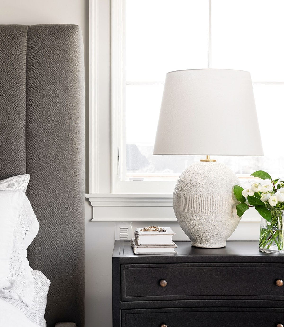 A serene primary bedroom featuring a sophisticated neutral palette with a tall upholstered gray headboard, black nightstand with brass hardware, and an elegant textured ceramic table lamp with cream shade. The abundant natural light from the white-trimmed window and carefully curated styling with fresh white flowers creates a refined, hotel-like atmosphere.
