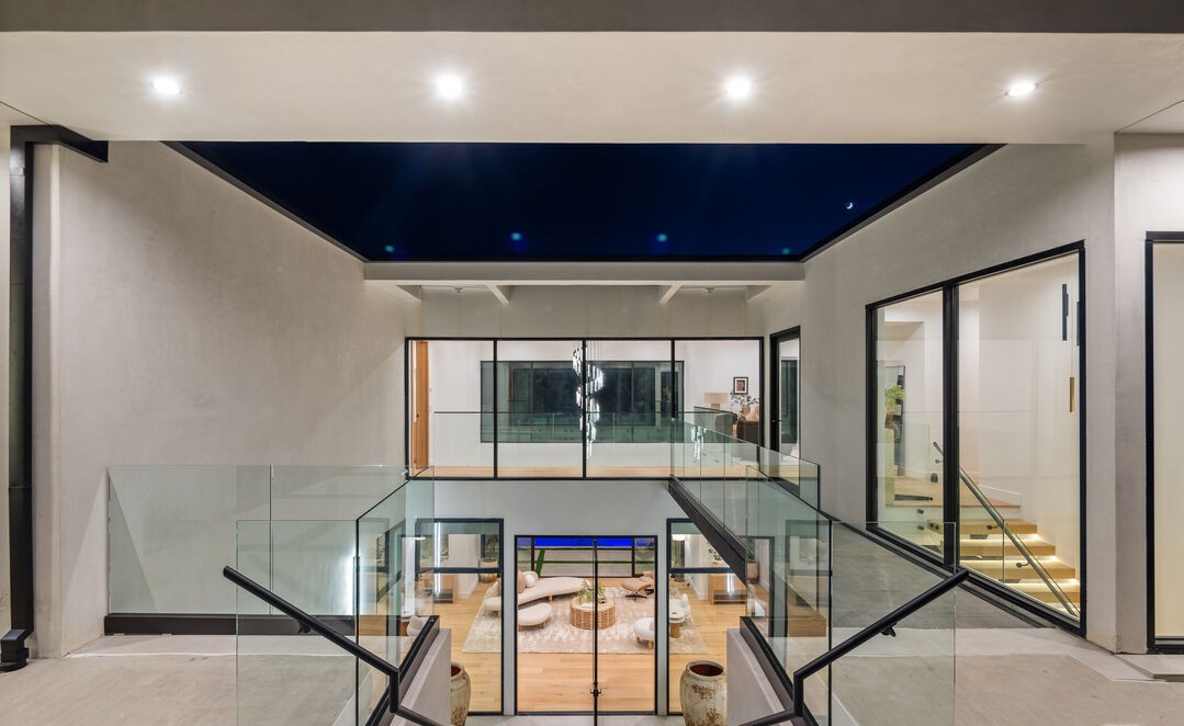A striking contemporary staircase featuring floating steps with a minimalist black metal frame and frameless glass railings that create an open, airy aesthetic. The dramatic navy tray ceiling with integrated recessed lighting and skylights contrasts elegantly with white walls and natural wood flooring, while the double-height open concept connects to a refined living space below with visible modern furnishings and large windows.