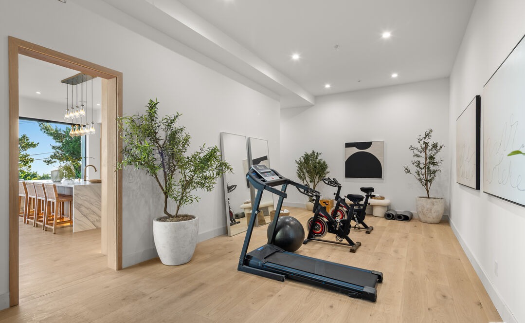 A stunning contemporary home gym featuring bright, airy minimalist design with abundant natural light, light oak hardwood flooring, and white walls accented by living plants and abstract artwork. The space seamlessly connects to an adjacent kitchen/dining area through a wooden-framed glass door, creating an open-concept feel that emphasizes wellness and modern luxury living.