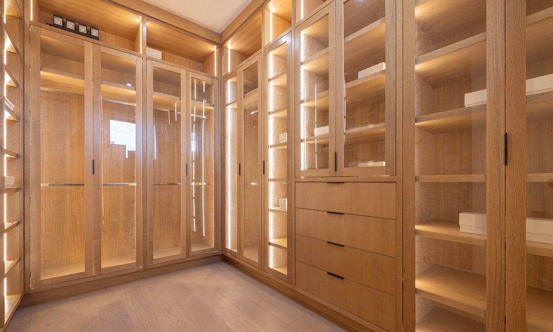 This ultra-luxury walk-in closet features extensive custom light oak cabinetry with glass-front doors and integrated shelving, meticulously illuminated with warm under-shelf LED lighting throughout. The sophisticated design combines clean modern lines with warm natural materials, creating a museum-quality storage and display space that balances functional organization with editorial design excellence.