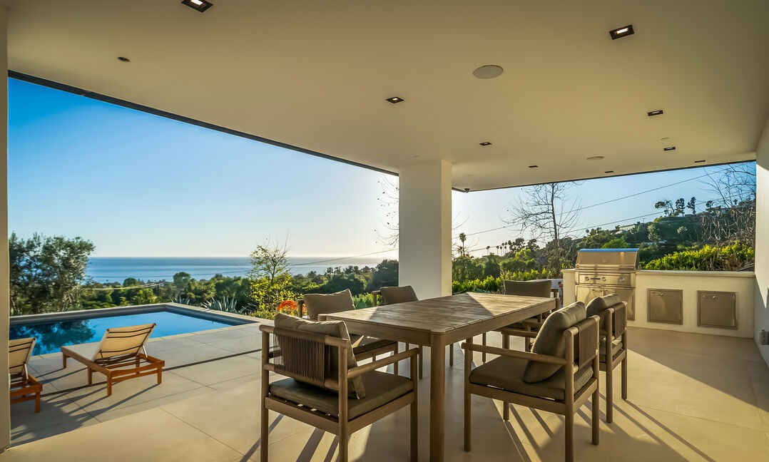 A sophisticated coastal-modern covered patio overlooking the Pacific Ocean, featuring a dining table with upholstered seating, abundant natural light, and seamless indoor-outdoor living anchored by a resort-style pool and panoramic ocean vistas. The neutral color palette and high-end stone flooring create a serene, resort-like atmosphere emphasizing unobstructed views and luxurious relaxation.