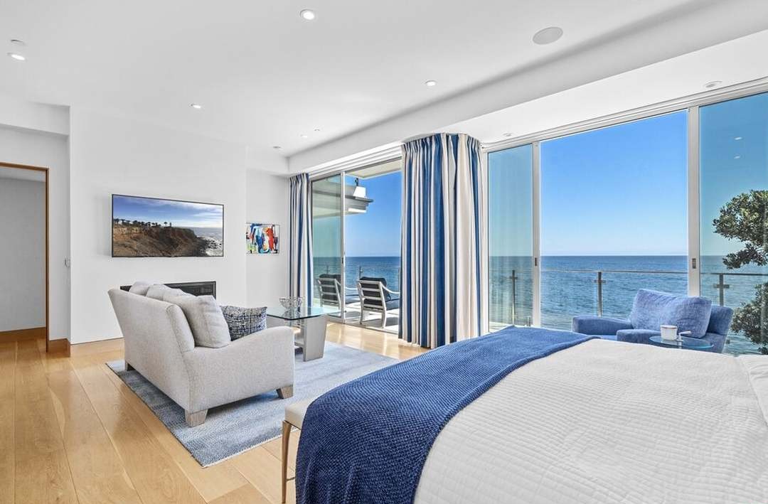 A stunning oceanfront primary bedroom suite featuring floor-to-ceiling glass doors that seamlessly integrate expansive water views with the interior living space. The design balances serene coastal aesthetics with organic modern comfort through a sophisticated palette of white, soft blue, and natural wood, elevated by premium furnishings and curated artwork.