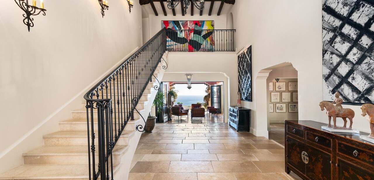 A grand Mediterranean-inspired hallway featuring a sculptural wrought-iron staircase with exposed timber beams and arched doorways, anchored by elegant stone flooring and opening to panoramic ocean views. The space masterfully blends Old World architectural details with contemporary luxury, punctuated by curated artwork and statement lighting that creates a gallery-like sophistication.