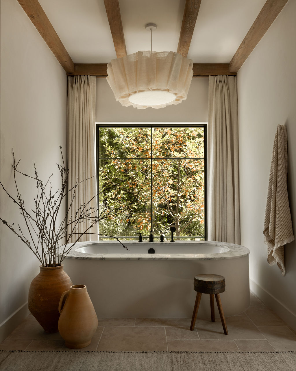 A serene spa-like bathroom featuring a freestanding soaking tub centered beneath a dramatic pendant light and large window overlooking lush foliage. The space combines natural wood ceiling beams with warm neutral tones, organic pottery, and minimalist furnishings to create a tranquil, Japanese-inspired retreat.