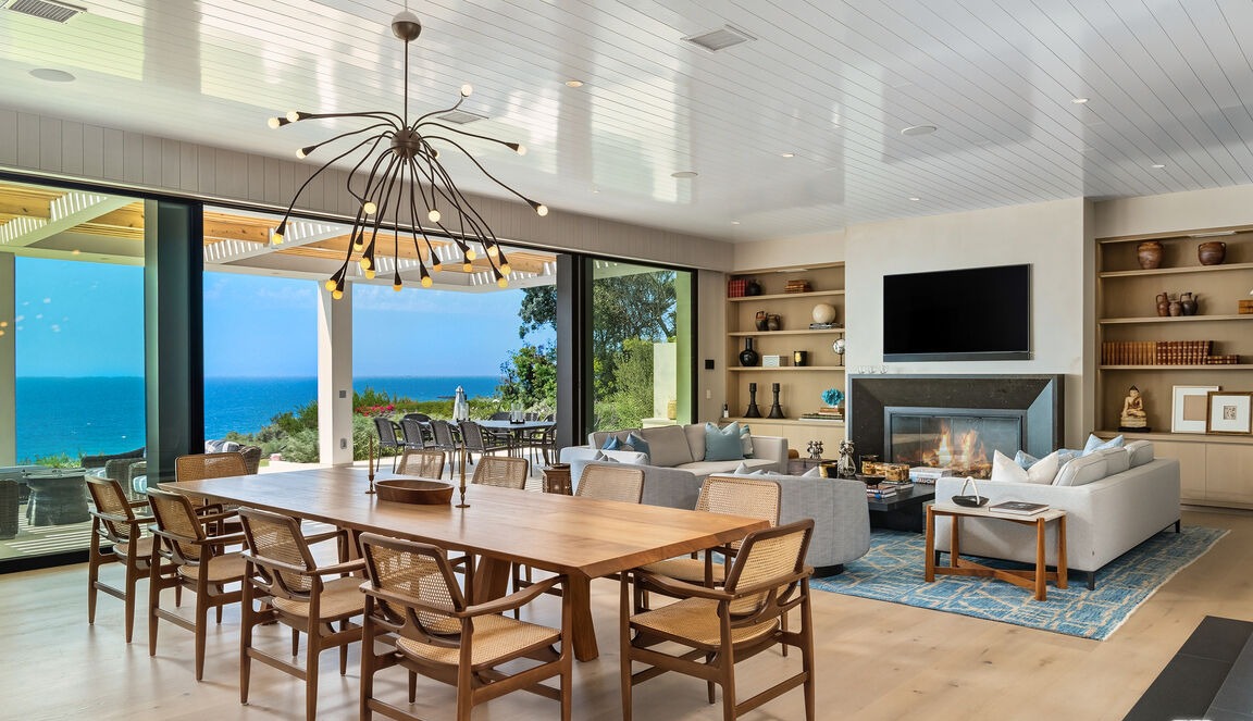 A breathtaking oceanfront living and dining space seamlessly blending organic modern and coastal aesthetics, anchored by expansive floor-to-ceiling glass walls framing panoramic water views and a sculptural brass chandelier. The room masterfully combines natural wood furnishings, soft linen upholstery, warm wood-plank ceilings, and open shelving with a sophisticated palette of whites, natural tones, and ocean blues—creating an effortlessly luxurious yet serene retreat.