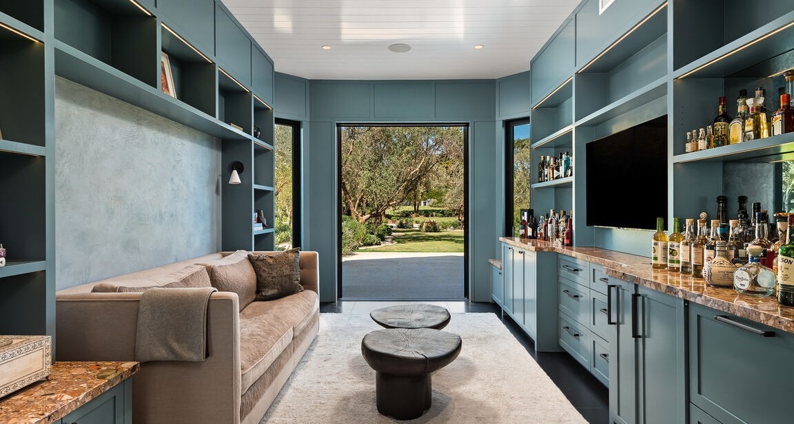 A sophisticated teal and sage green bar lounge with custom built-in cabinetry, marble countertops, and warm wood accents that opens directly to lush outdoor grounds through floor-to-ceiling glass doors. The space expertly balances cool-toned cabinetry with warm materials and abundant natural light, creating an elegant yet inviting retreat for entertaining.