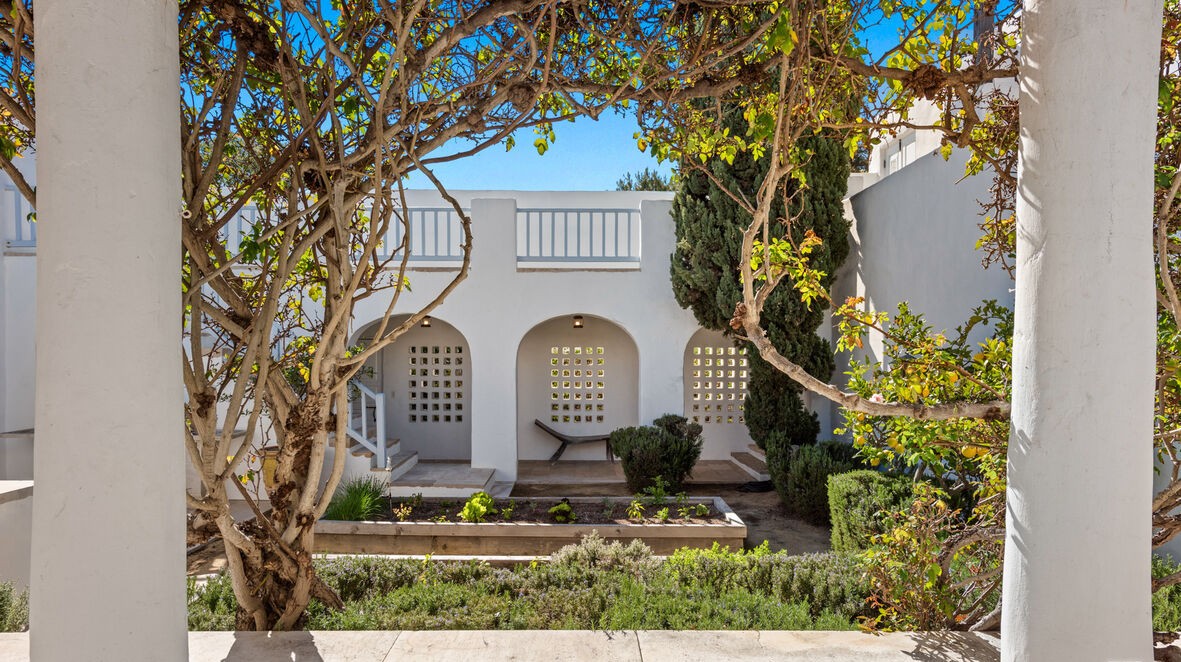 An elegant Mediterranean-inspired courtyard features a colonnade of white-painted columns framing arched openings with decorative lattice screening, all unified by a natural wood pergola overhead draped with flowering vines. The serene outdoor living space combines Tuscan architecture, soft neutral tones, and sculptural cypress plantings to create a sophisticated European-style retreat.