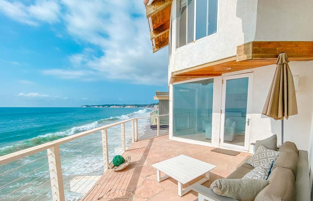 A stunning oceanfront patio featuring pristine ocean views, light wood and white architectural details, and curated coastal furnishings that exemplify California luxury living. The space seamlessly blends indoor-outdoor comfort with an airy, serene atmosphere enhanced by abundant natural light and unobstructed beach vistas.