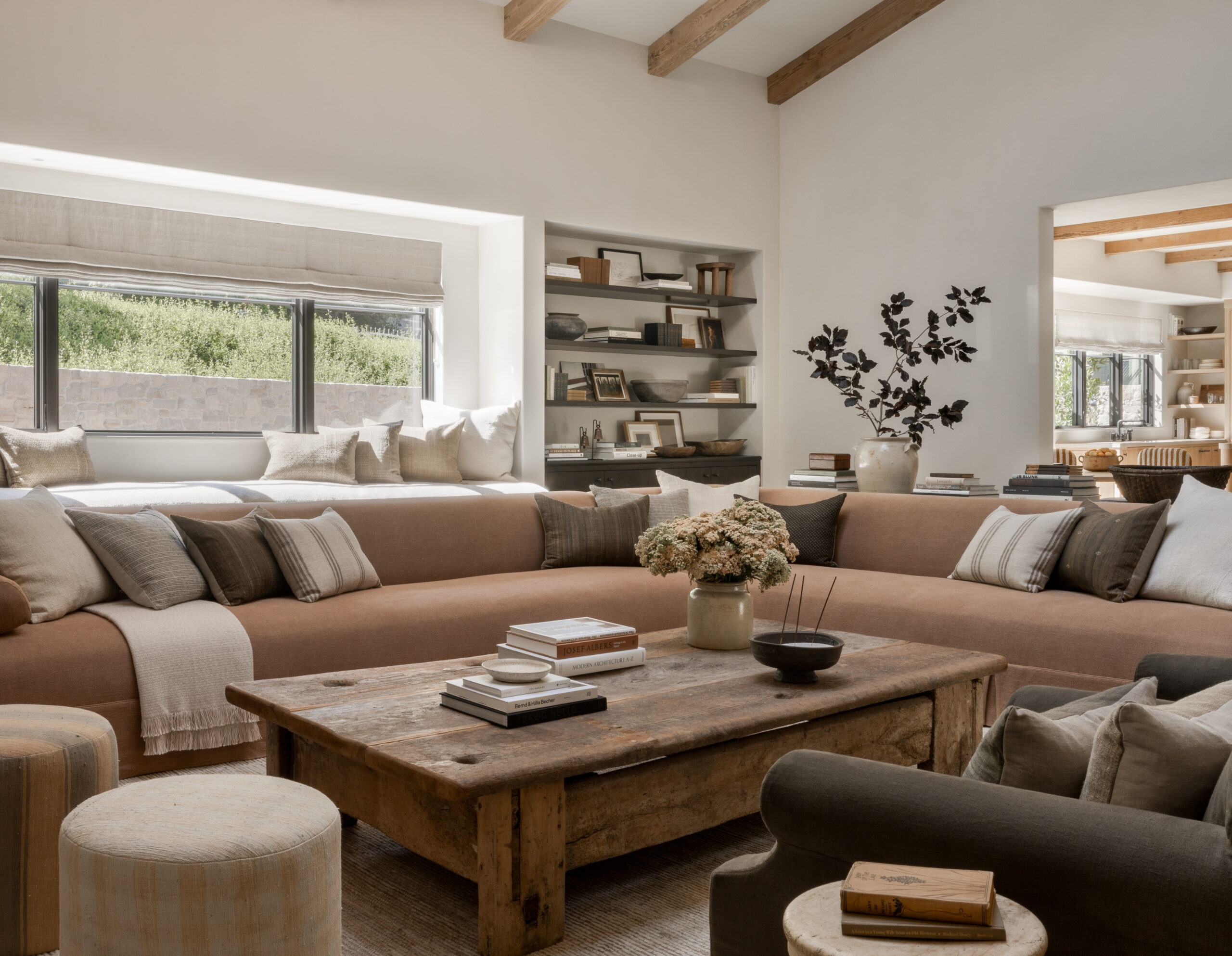 This serene living room features exposed wood beams and built-in shelving flanking a large window seat, creating an organic modern aesthetic with abundant natural light. The space is anchored by generous taupe sectional sofas arranged around a rustic wood coffee table, with earth-toned textiles and natural materials throughout establishing a warm, sophisticated atmosphere.