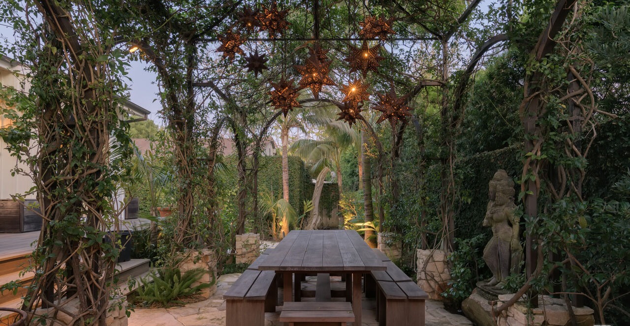 An enchanting covered patio garden featuring a sophisticated pergola with climbing ivy, weathered wood dining furniture, and atmospheric landscape lighting that creates a romantic ambiance at dusk. The space seamlessly blends Mediterranean and organic modern aesthetics with mature specimen plants, stone sculptures, and pavers that evoke a luxurious European villa courtyard.