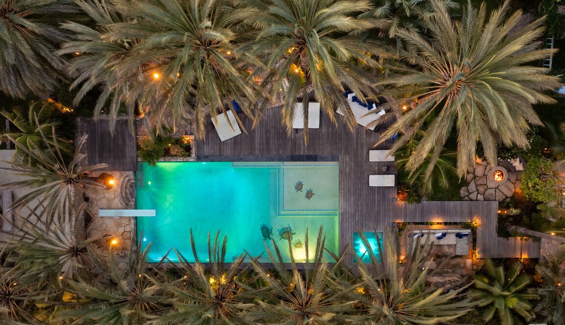 An elevated aerial view of a stunning modern resort-style pool area featuring a glowing turquoise infinity pool with integrated spa jets, surrounded by sophisticated composite decking, mature specimen palms, ambient warm accent lighting, and curated lounge seating. The design exemplifies contemporary luxury outdoor living with seamless indoor-outdoor integration and meticulous landscape architecture.