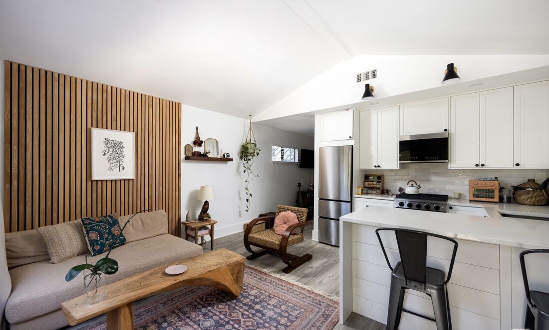 A sophisticated open-concept living/kitchen space featuring a striking vertical wood-slat accent wall that anchors the seating area, paired with clean-lined white shaker cabinetry and warm natural materials throughout. The design balances contemporary minimalism with organic warmth, creating an inviting yet refined space enhanced by abundant natural light and layered black metal accents.