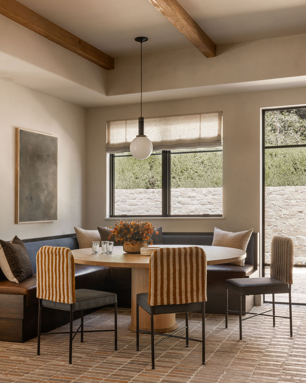 A warm and inviting dining room featuring an organic modern aesthetic with exposed wood beams, brick flooring, and a built-in leather banquette surrounding a round natural wood table. The burnt orange striped dining chairs and globe pendant lighting add sophisticated pops of color and texture against the neutral backdrop.