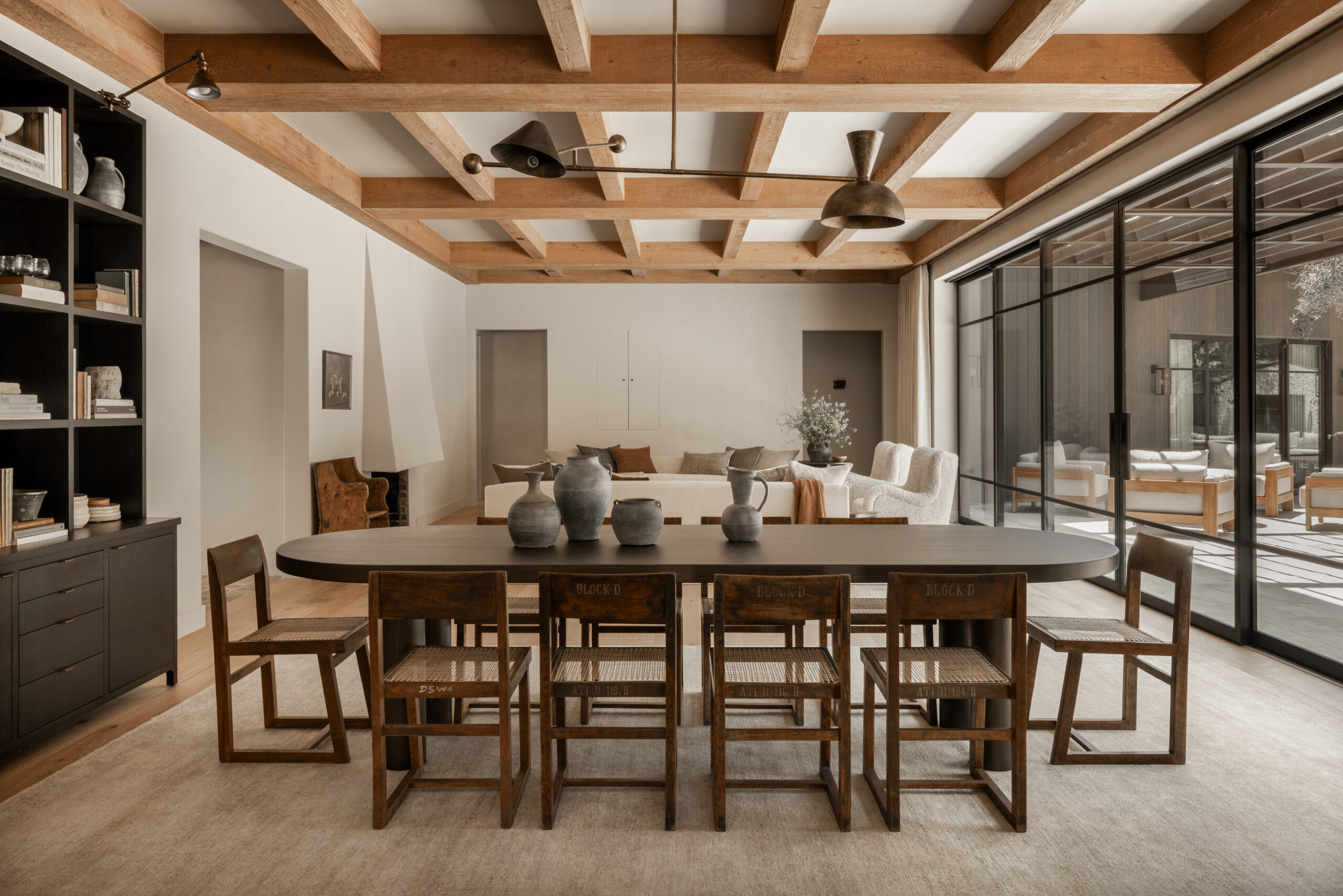 A stunning organic modern dining room featuring dramatic exposed wood beam ceiling, floor-to-ceiling black steel-framed glass doors, and a large custom dark wood dining table surrounded by simple wooden chairs. The space seamlessly blends natural materials with minimalist sophistication, anchored by terracotta and gray ceramic vessels as centerpiece and abundant natural light flowing through expansive windows.