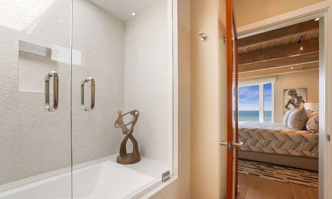 A stunning oceanfront primary bathroom featuring a spa-like walk-in shower with frameless glass enclosure and textured white subway tile, anchored by brass hardware and a sculptural bronze art piece. Floor-to-ceiling windows frame breathtaking ocean and beach views, creating an airy, serene sanctuary that seamlessly blends luxury materiality with organic coastal aesthetics.
