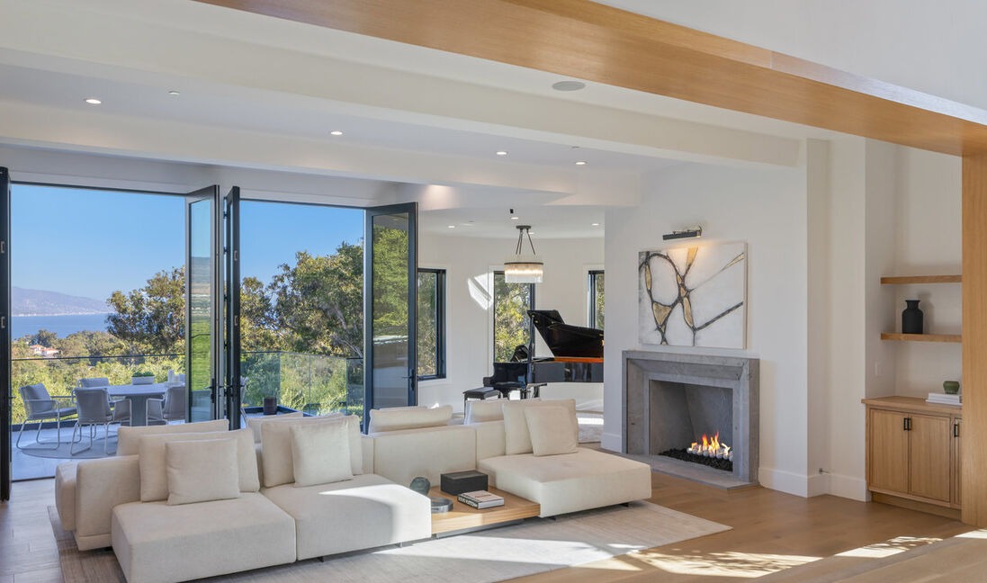 A stunning contemporary great room showcasing organic modernism with abundant natural light, sophisticated material layering, and seamless indoor-outdoor flow via floor-to-ceiling glass doors. The space balances warmth through natural wood beams and cream linen furnishings with cool architectural elements like a concrete fireplace and coffered ceiling, creating an editorial-quality luxury living environment with a concert grand piano as a stunning focal point.