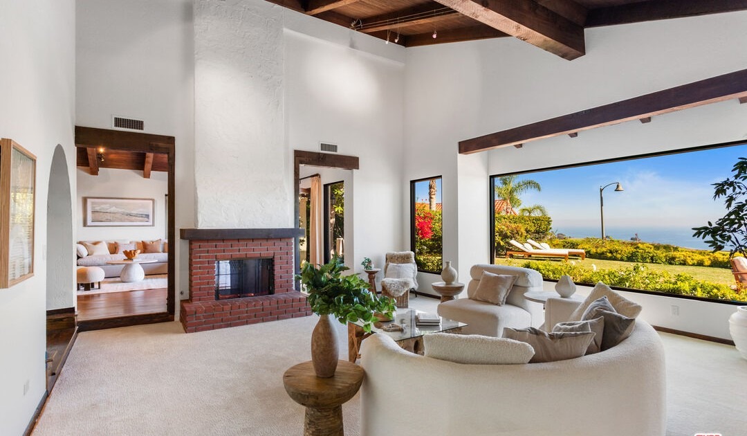 This expansive great room exemplifies sophisticated California modern luxury with soaring exposed wood-beam ceilings, a striking red-brick fireplace, and floor-to-ceiling windows framing panoramic coastal views. The palette of warm creams, natural textiles, and earthy tones creates an inviting yet refined sanctuary that seamlessly blends traditional architectural bones with contemporary comfort.
