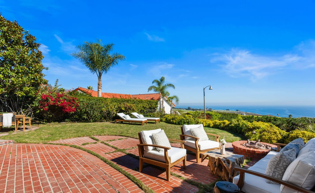 A stunning coastal patio with sweeping ocean views, featuring teak lounge chairs with crisp white cushions arranged on warm terracotta brick pavers overlooking lush subtropical gardens and the blue Mediterranean Sea. The space masterfully blends organic materials with contemporary furnishings, creating a serene yet sophisticated outdoor living environment ideal for both relaxation and entertainment.