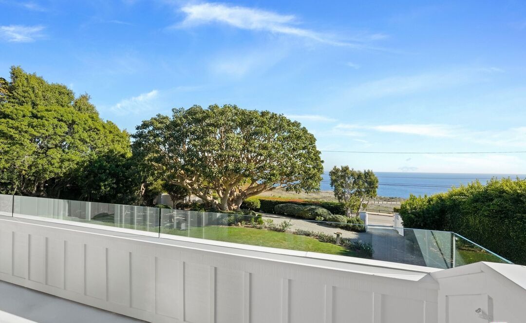 An elevated coastal terrace featuring a sophisticated minimalist design with clean white railings and concrete decking that frames an expansive ocean view. The space seamlessly integrates manicured landscaping with mature specimen trees, embodying refined outdoor living with an emphasis on the natural seascape and serene, uncluttered design aesthetic.
