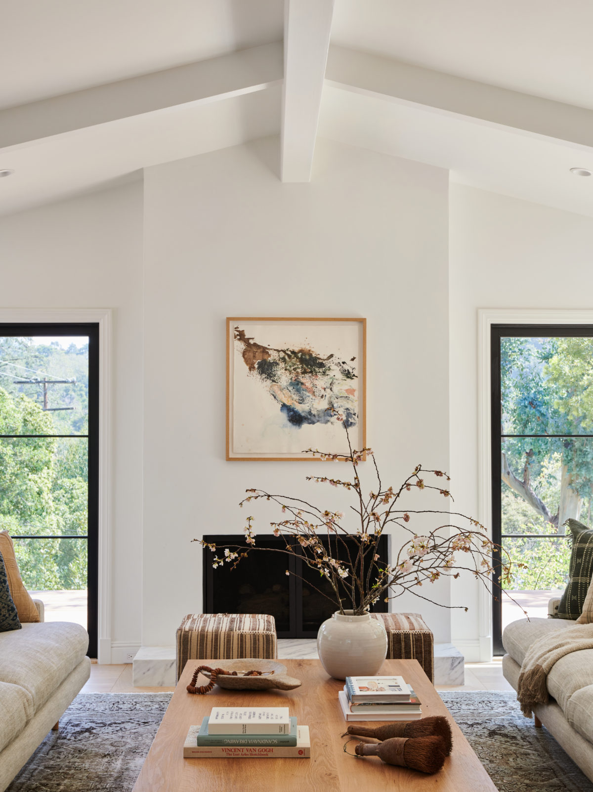 A serene organic modern living room featuring soaring vaulted ceilings with exposed white beams, floor-to-ceiling black-framed windows flanking a minimalist fireplace, and a carefully curated palette of natural materials including a raw wood coffee table, sculptural ceramic vase with dried branches, and an abstract artwork in earth tones. The space achieves sophisticated warmth through its combination of architectural drama, abundant natural light, and organic textures while maintaining clean modernist lines.
