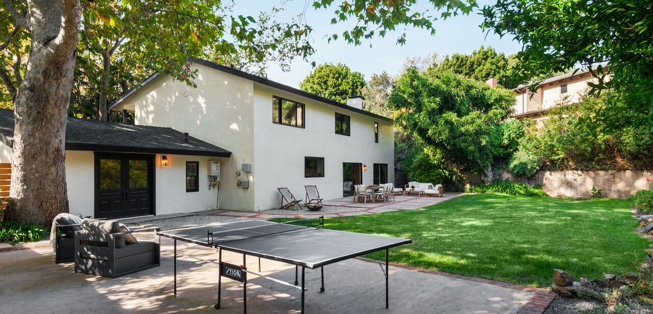 A sophisticated outdoor living space seamlessly blending modern minimalism with natural landscape elements, featuring a concrete patio with contemporary lounge and dining furniture, lush green lawn, and mature trees that frame a renovated mid-century modern home. The design emphasizes clean lines, neutral tones, and indoor-outdoor flow with thoughtful landscaping and casual luxury appeal.