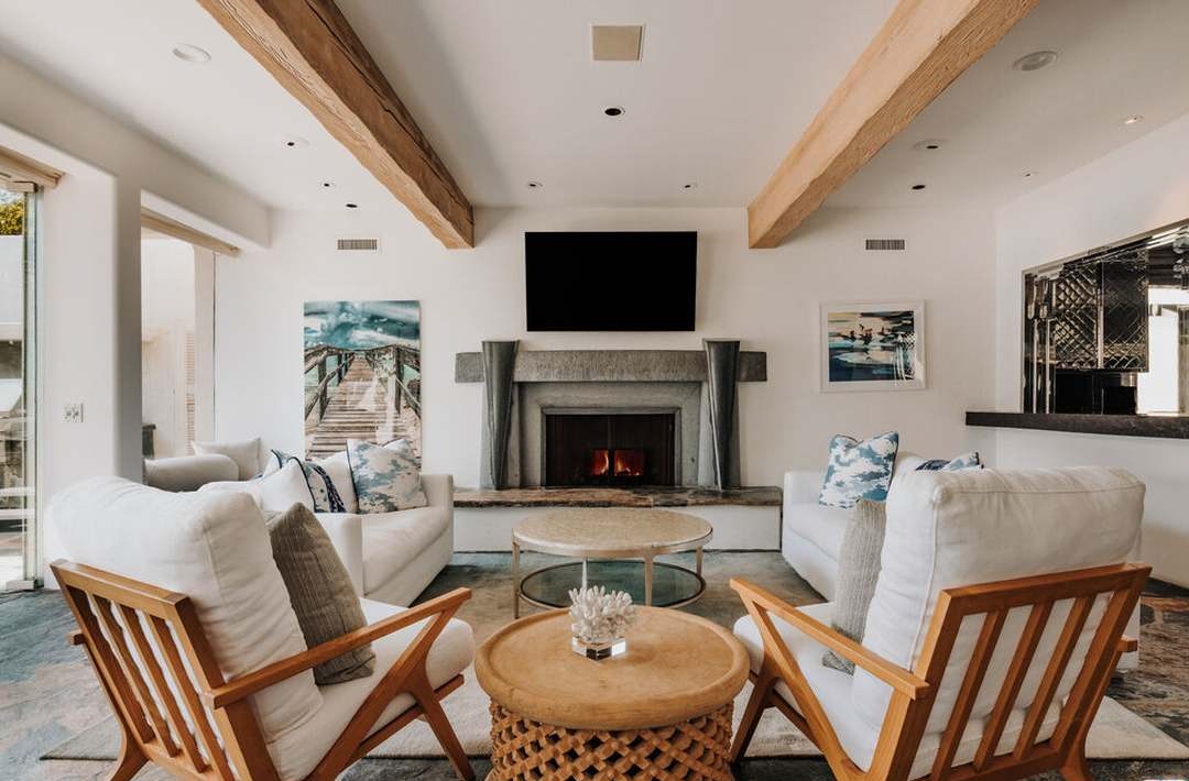 A sophisticated family room anchored by a contemporary fireplace and unified by exposed wooden beams that create architectural warmth against clean white walls. The space balances organic modern elements—walnut mid-century chairs, woven wood accent tables, natural linens—with coastal-inspired artwork and blue-teal accents, creating a serene yet curated luxury retreat flooded with natural light.