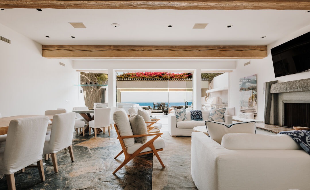 This sophisticated coastal living space seamlessly blends organic modern design with luxury resort aesthetics, featuring soaring wood-beam ceilings, abundant natural light from floor-to-ceiling ocean-view windows, and a curated palette of cream, white, and natural wood furnishings arranged in an open-concept layout. The refined material palette—stone flooring, linen upholstery, mid-century walnut accent chairs, and carefully selected coastal accents—creates an effortlessly elegant sanctuary with remarkable depth and visual interest.