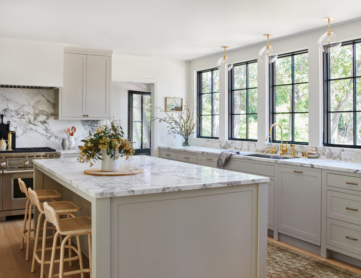 A stunning transitional kitchen featuring a marble waterfall island, soft white cabinetry, and abundant natural light from floor-to-ceiling black-framed windows overlooking lush greenery. The space combines classic shaker-style millwork with contemporary brass fixtures and sculptural glass pendant lighting, creating an elegant balance between timeless elegance and modern luxury.