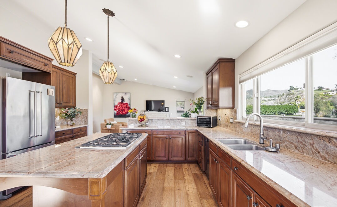 This sophisticated kitchen showcases a timeless blend of transitional and organic modern design, featuring warm-toned wood cabinetry, dramatic marble countertops with a striking backsplash, and abundant natural light from expansive hillside-view windows. The brass-finished statement pendants and professional-grade appliances elevate the space, creating a warm yet refined culinary environment that balances classic elegance with contemporary comfort.