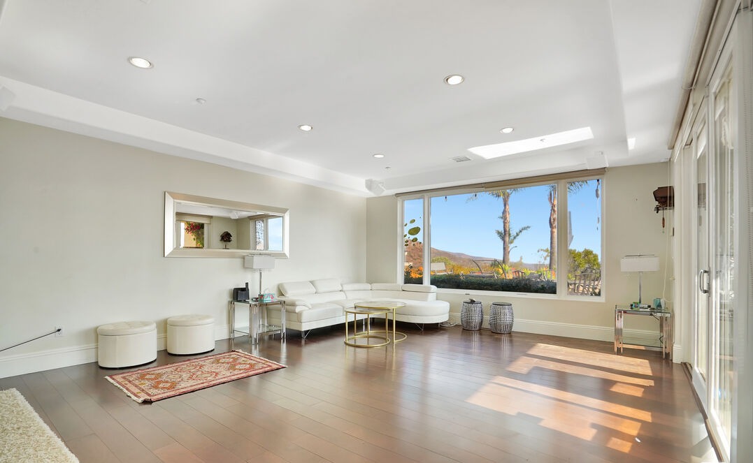 A luminous, sophisticated living room showcasing floor-to-ceiling windows framing expansive outdoor views and abundant natural light. The serene space features a warm neutral palette, premium hardwood flooring, tailored cream upholstery, and layered brass-finished lighting fixtures beneath a custom tray ceiling, creating an airy yet luxurious retreat.