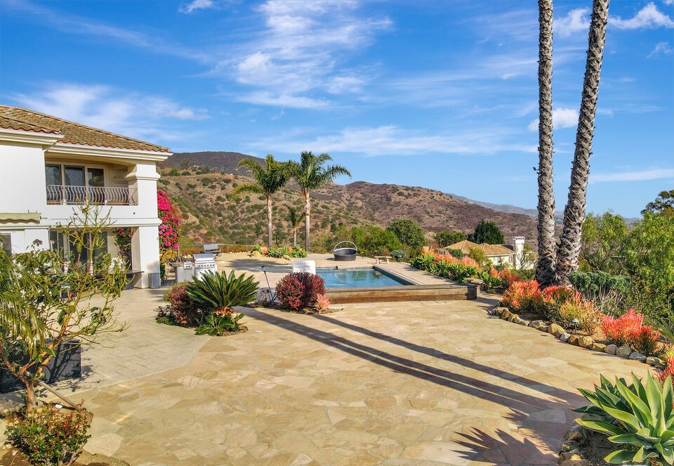 A sophisticated desert-modern pool retreat seamlessly integrating indoor-outdoor living, featuring a pristine rectangular pool, manicured drought-resistant landscaping with mature palm trees, and a white Mediterranean-influenced residence with built-in outdoor amenities set against rolling brown foothills. The composition exemplifies high-desert luxury design with warm stone pavers, layered plantings, and seamless integration of architecture with the arid landscape.