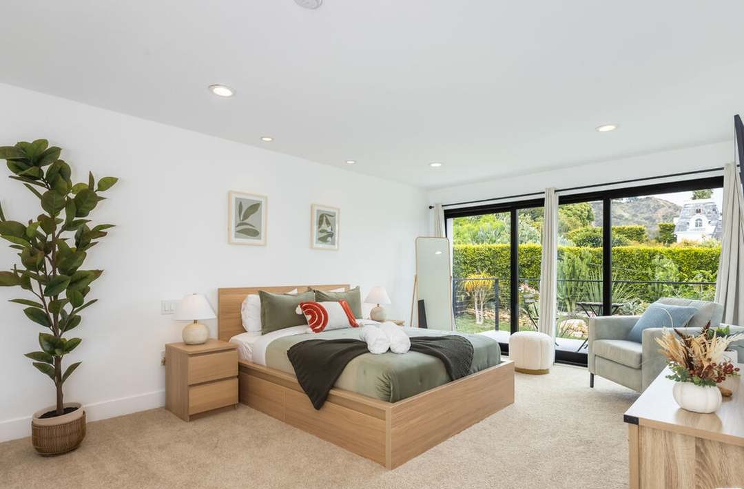 A serene primary bedroom suite featuring a warm natural wood bed frame anchored by neutral linens and accent pillows, paired with floor-to-ceiling sliding glass doors that flood the space with abundant natural light and showcase manicured garden views. The room seamlessly integrates a comfortable seating area, warm-toned furnishings, and layered lighting to create a sophisticated retreat with organic modern sensibility.