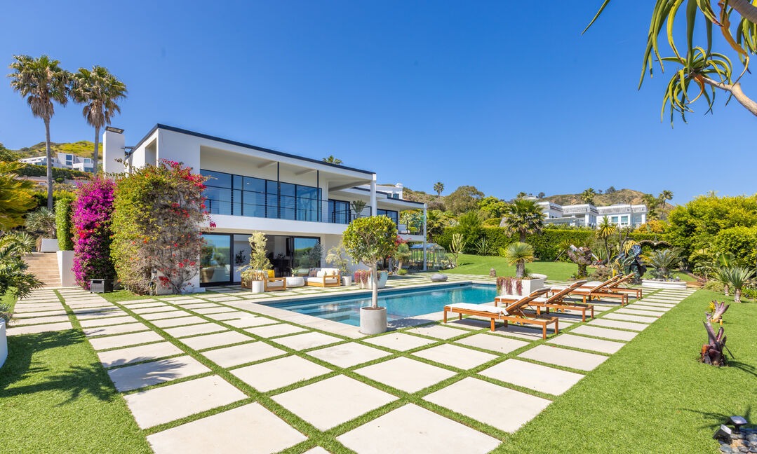 A stunning contemporary poolside oasis featuring a pristine infinity-edge pool set within a meticulously landscaped property, anchored by a striking white modern pavilion with floor-to-ceiling glass walls and clean geometric lines. The composition elegantly balances hardscape concrete pavers with lush verdant lawn and vibrant flowering vines, creating a serene resort-like retreat that exemplifies high-end California modern living.