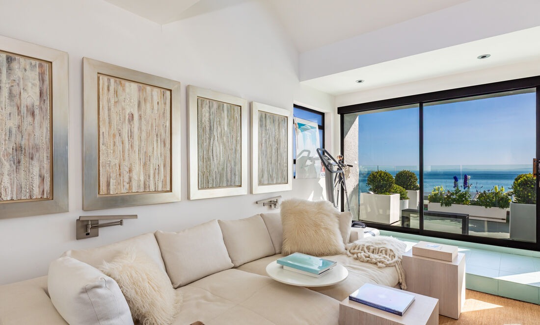 A stunning coastal-inspired family room with floor-to-ceiling windows framing a breathtaking ocean vista, anchored by a cream linen sectional and accented by soft neutral tones and whitewashed wood art. The space seamlessly blends indoor-outdoor living with a tray ceiling, recessed lighting, and curated minimalist furnishings that evoke serene, sophisticated coastal luxury.