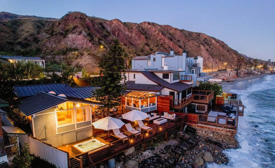 A stunning waterfront patio retreat bathed in twilight, featuring modern minimalist architecture with white metal cladding, warm wood furnishings, and lounge seating beneath market umbrellas overlooking a dramatic rocky coastline and illuminated hillside. The space seamlessly blends coastal elegance with organic modernism, offering an intimate yet sophisticated outdoor living experience with commanding ocean views and carefully curated ambient lighting.