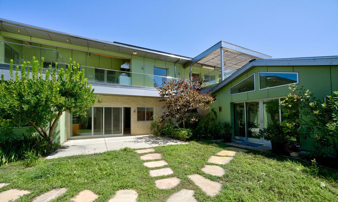 A sophisticated modern courtyard blending indoor-outdoor living with clean architectural lines, verdant landscaping, and seamless glass integration. The serene composition features a manicured lawn with stepping stone pathway leading to a minimalist patio anchored by a contemporary pergola structure and floor-to-ceiling glazing that dissolves the boundary between interior and exterior spaces.