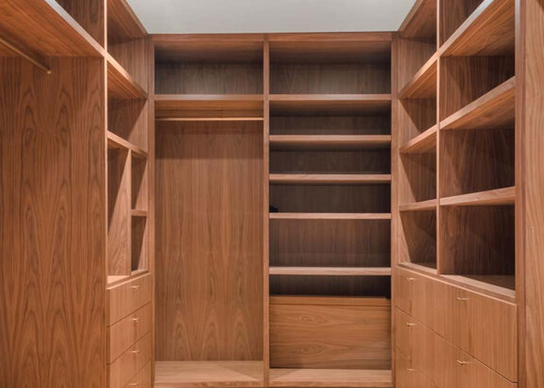 A sophisticated walk-in closet featuring warm walnut wood cabinetry with sleek flat-panel doors and open shelving, accented by polished chrome hardware. The space combines bespoke custom millwork with clean modern lines, hardwood flooring, and recessed lighting to create an exceptionally organized and luxurious storage environment.