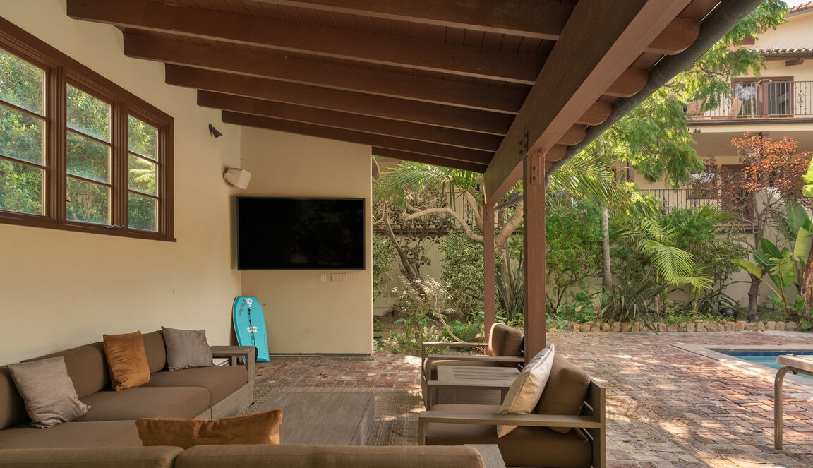 A sophisticated outdoor living pavilion seamlessly blending indoor and outdoor spaces with exposed timber beams, warm neutral tones, and lush tropical landscaping. The design emphasizes relaxed luxury with carefully curated furnishings, abundant natural light, and a direct visual connection to the pool and manicured gardens beyond.