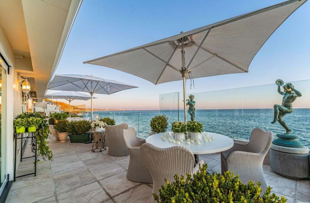 A sophisticated waterfront patio featuring pristine white umbrellas, minimalist furnishings, and expansive ocean views framed by floor-to-ceiling glass panels. The space epitomizes contemporary coastal luxury with its neutral palette, sculptural bronze accents, and seamless indoor-outdoor living design.