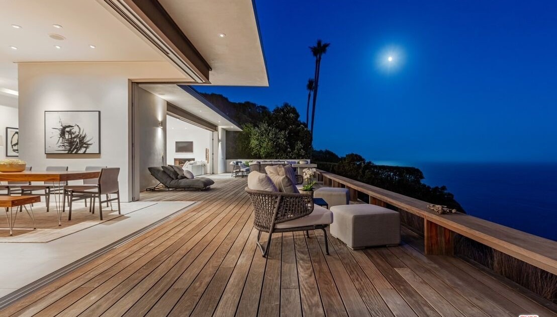 A breathtaking modern oceanfront patio featuring warm composite wood decking, contemporary furnishings in neutral linen and woven materials, and seamless indoor-outdoor integration with dramatic twilight ocean views. The space exemplifies luxury coastal living with sophisticated material choices, minimalist furniture placement, and professional architectural design that balances open elegance with functional comfort.