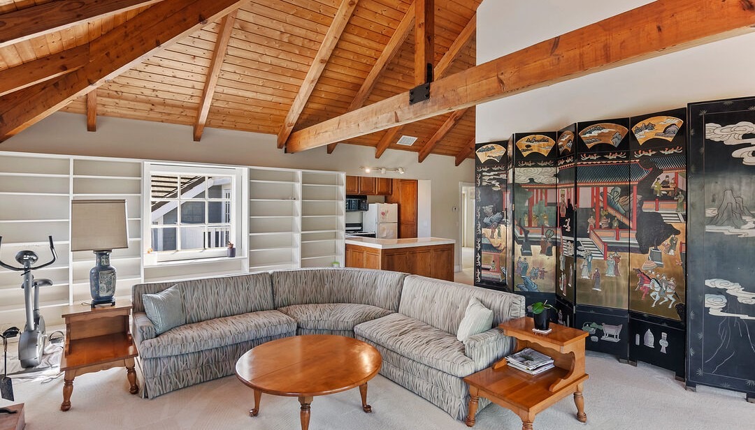 A sophisticated transitional living room featuring dramatic exposed wood beam ceiling architecture paired with soft cream walls and warm wood furnishings. The space balances traditional architectural details with contemporary furniture and a striking black lacquered Asian-inspired accent wall, creating an elegant and layered composition.