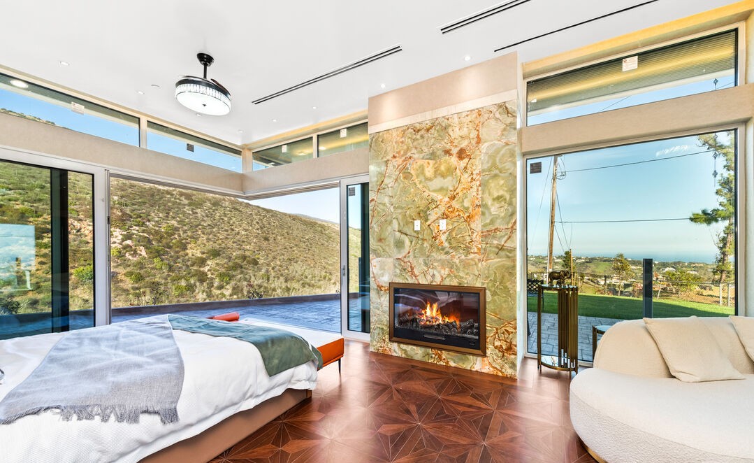 A breathtaking primary bedroom suite with expansive floor-to-ceiling windows framing panoramic desert and valley views, anchored by a striking golden marble accent wall with an integrated fireplace. The space seamlessly blends organic modern design with desert sensibilities through warm earth tones, natural wood flooring, minimal furnishings, and abundant natural light amplified by skylights, creating an elevated sanctuary that prioritizes serenity and connection to the landscape.