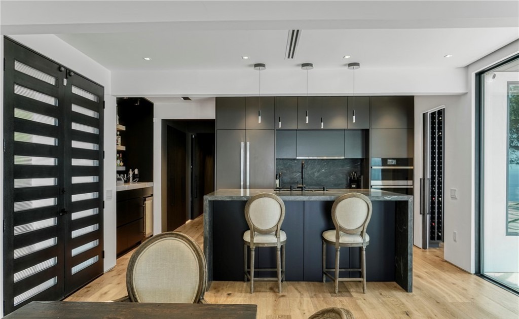 A sophisticated modern kitchen featuring a striking navy island with waterfall-edge quartz countertops anchored by contemporary pendant lighting and modern bar seating. The design seamlessly blends warm natural wood flooring with sleek black hardware and minimalist cabinetry, enhanced by abundant natural light from floor-to-ceiling windows and a dramatic stone backsplash that grounds the cool palette in organic elegance.